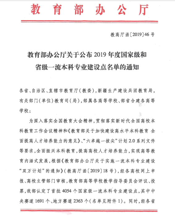 近日,根据《教育部办公厅关于公布2019年度国家级和省级一流本科专业建设点名单的通知(高教厅函〔2019〕46号)》,中文博彩平台